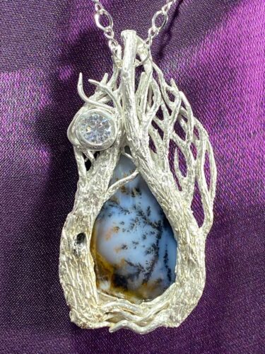 Then, I took my work to the third dimension in Metal Clay. Silver clay is silver in a polymer that is moldable, sculptable silver, and after it is kiln-fired, it becomes fine silver (.999) or .960 silver. I fashion one of a kind pieces that compliment pictures I see in the stones I cut. Generally, my Metal Clay work consists of sculptured, realistic flowers, vines and trees, but I sometimes incorporate dragons, fairies and stars.